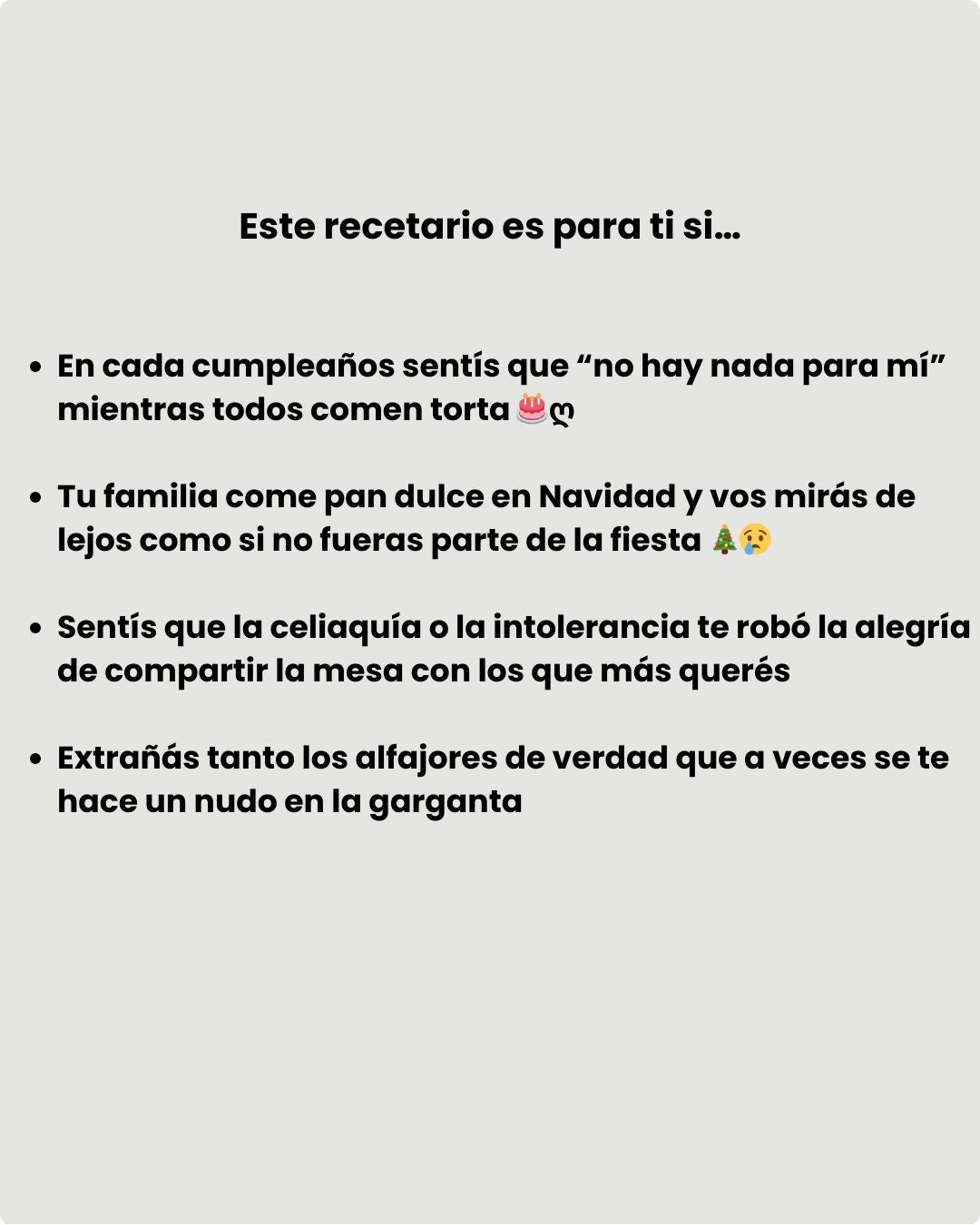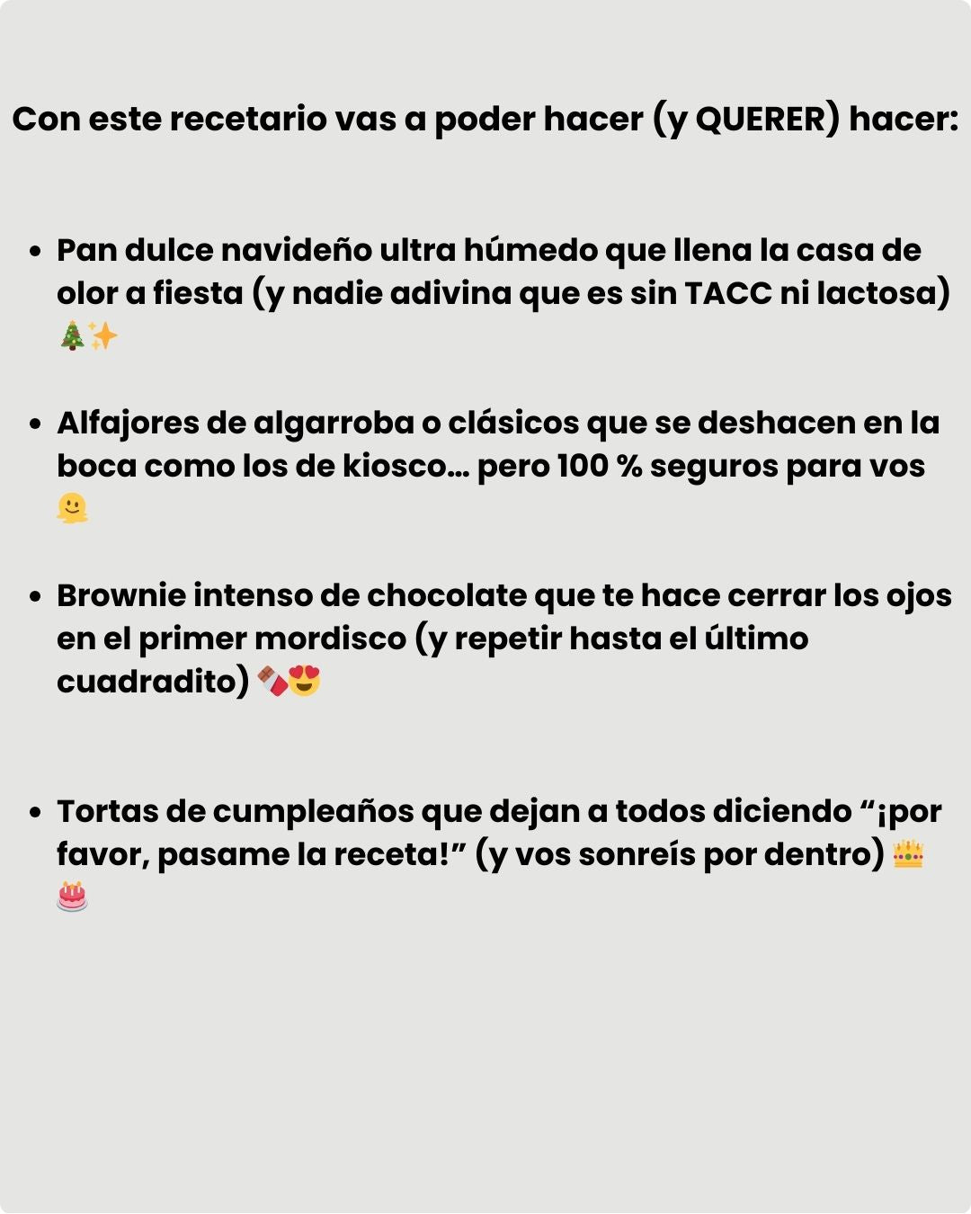 Imagina esto: ✅ Desayunos que te hacen saltar de la cama (pancakes esponjosos, muffins de chocolate que se derriten en la boca) ✅ Comidas rápidas que resuelven el “¿qué como hoy?” en menos de 30 minutos ✅ Cenas que hasta para impresionar a los que NO tienen restricciones (sí, de verdad) ✅ Postres pecaminosos que nadie creerá que son sin gluten ni lactosa (alfajores, brownies, helado casero…)